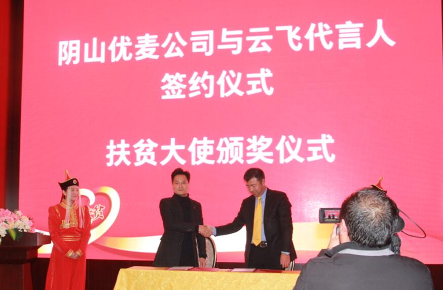 會上,陰山優(yōu)麥與云飛簽訂品牌代言協(xié)議,并由劉超旗長為云飛頒發(fā)“扶貧大使”證書和獎杯,并希望他發(fā)揮號召作用,繼續(xù)助推地方特色產(chǎn)品,提升市場認知度。云飛在發(fā)言中講到,內(nèi)蒙古的農(nóng)畜產(chǎn)品,尤其像陰山優(yōu)麥這種地方特色產(chǎn)品深受社會各界的喜愛。同時表示,作為公司的代言人,日后定會為產(chǎn)品的宣傳推廣作出積極的努力。