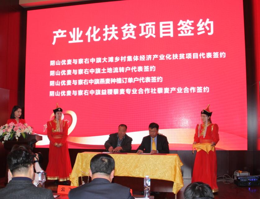 會議期間,內(nèi)蒙古陰山優(yōu)麥食品有限公司還分別與察右中旗大灘鄉(xiāng)集體經(jīng)濟產(chǎn)業(yè)化扶貧項目代表、察右中旗土地流轉(zhuǎn)戶代表、察右中旗燕麥種植訂單戶代表和察右中旗易稷藜麥專業(yè)合作社進行了現(xiàn)場簽約。