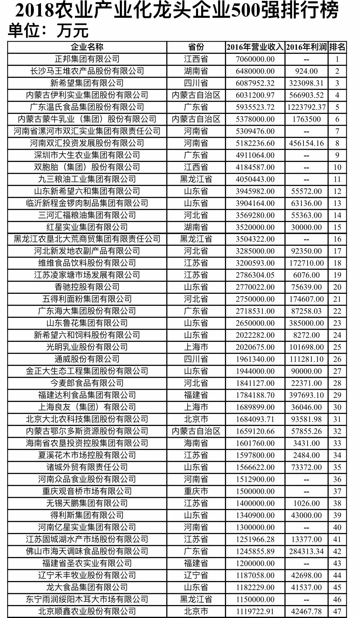 新型農(nóng)業(yè)經(jīng)營主體是發(fā)展現(xiàn)代農(nóng)業(yè)和實(shí)現(xiàn)鄉(xiāng)村振興的重要力量。為全面了解各類新型農(nóng)業(yè)經(jīng)營主體的發(fā)展情況,在相關(guān)主管部門和各省區(qū)市的大力支持下,農(nóng)民日報(bào)社組織權(quán)威專家開展課題研究,并采集和梳理大量數(shù)據(jù),依據(jù)2016年?duì)I業(yè)收入進(jìn)行排名,入圍門檻為6.11億元,綜合形成了《2018農(nóng)業(yè)產(chǎn)業(yè)化龍頭企業(yè)500強(qiáng)排行榜》。