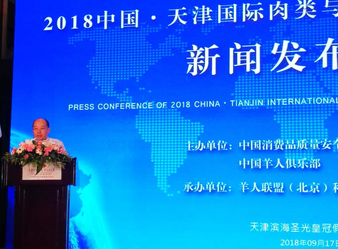 2018年9月17日,“2018天津國際肉類與食品進(jìn)出口博覽會”新聞發(fā)布會在天津濱海圣光皇冠假日酒店召開。中國消費品質(zhì)量安全促進(jìn)會秘書長曾召朋,天津市商務(wù)委員會副主任劉東水,內(nèi)蒙古農(nóng)牧業(yè)產(chǎn)業(yè)化龍頭企業(yè)協(xié)會執(zhí)行會長林永亮,副會長、內(nèi)蒙古大盛業(yè)羊絨制品有限公司總經(jīng)理魯耀武等相關(guān)負(fù)責(zé)人出席會議并致辭。
