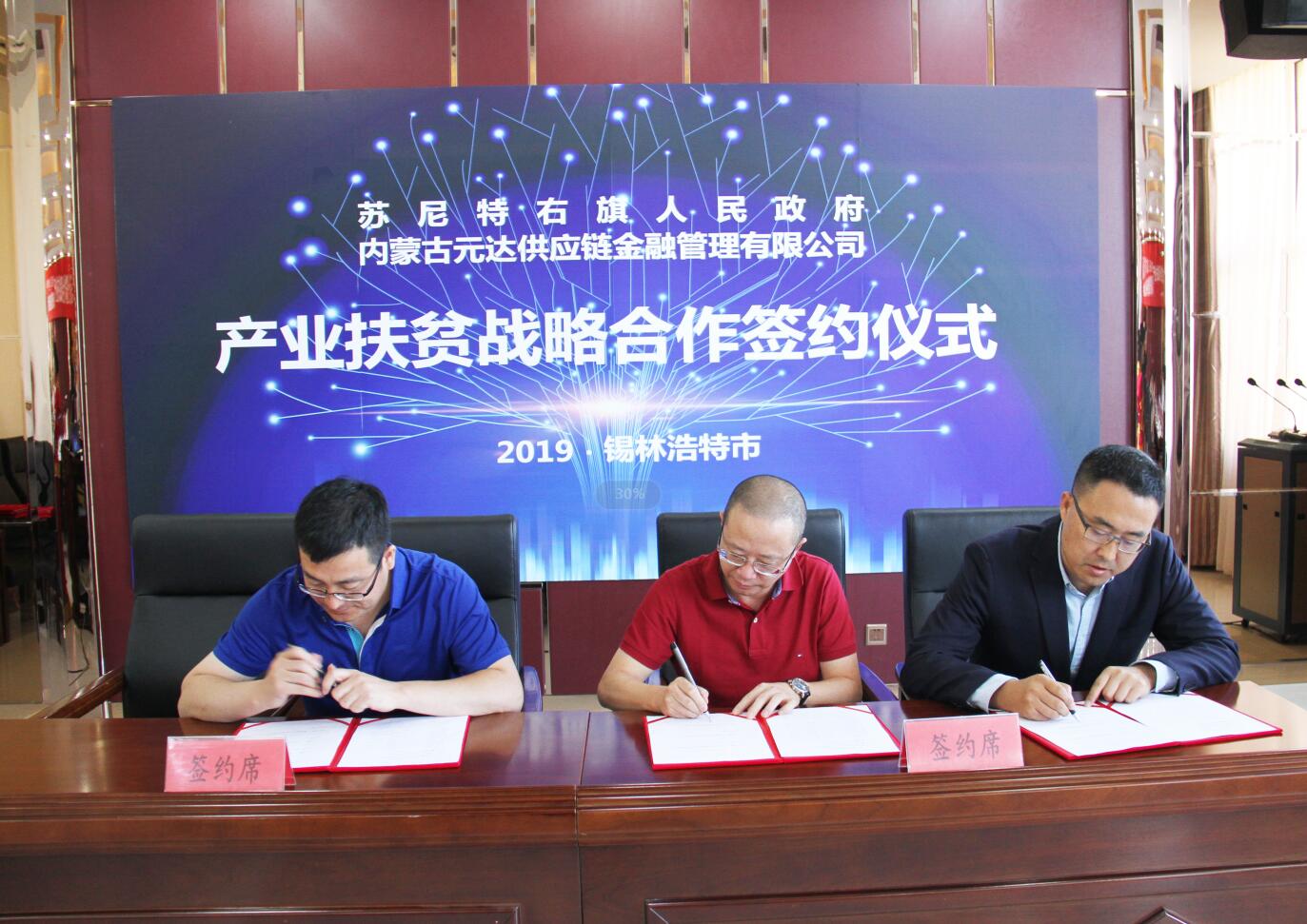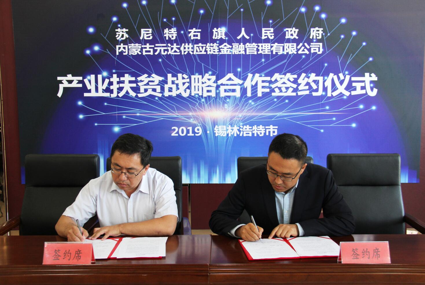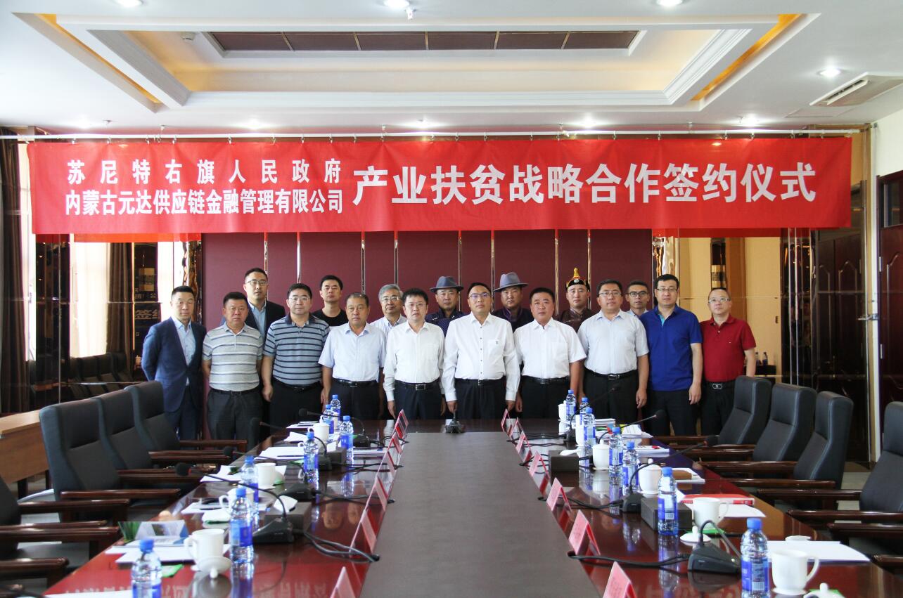2019年9月2日,內(nèi)蒙古農(nóng)牧業(yè)產(chǎn)業(yè)化龍頭企業(yè)協(xié)會會員單位、內(nèi)蒙古元達(dá)供應(yīng)鏈金融管理有限公司與蘇尼特右旗人民政府產(chǎn)業(yè)扶貧戰(zhàn)略合作簽約儀式在錫林浩特市成功舉行。