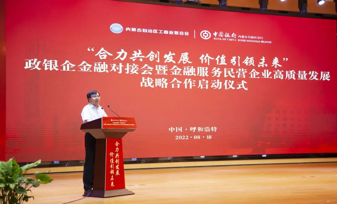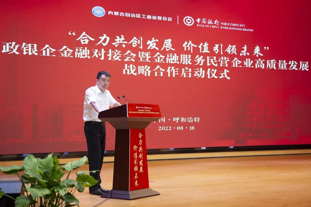 胡文勇行長在開場致辭中表示,一直以來,自治區(qū)工商聯充分發(fā)揮統(tǒng)戰(zhàn)性、經濟性、民間性綜合優(yōu)勢,團結和帶領廣大非公有制經濟人士,與時俱進,大膽創(chuàng)新,努力實踐,推動優(yōu)化營商環(huán)境,促進我區(qū)非公有制經濟又好又快發(fā)展,為全面建設小康社會、構建和諧社會作出重要貢獻。作為唯一一家持續(xù)經營超過百年的國有大行,中國銀行秉承“融通世界、造福社會”的崇高使命,將自身發(fā)展與地方經濟發(fā)展緊密相連,主動擔當服務支持民營企業(yè)發(fā)展壯大的金融重任。未來,中國銀行內蒙古區(qū)分行將繼續(xù)深耕細作民營經濟領域的融資服務,在普惠金融、科技金融、綠色金融等領域加強金融支持,緩解小微企業(yè)“融資難、融資貴”問題,助企紓困,風雨同舟,為深化政銀企合作共贏發(fā)展貢獻新力量!