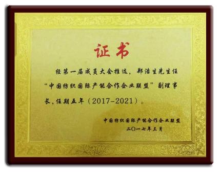 鄭浩生先生任2017-2021“中國(guó)紡織國(guó)際產(chǎn)能企業(yè)聯(lián)盟”副理事長(zhǎng)獎(jiǎng)牌