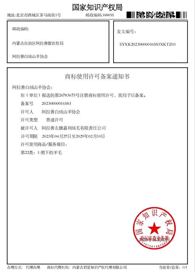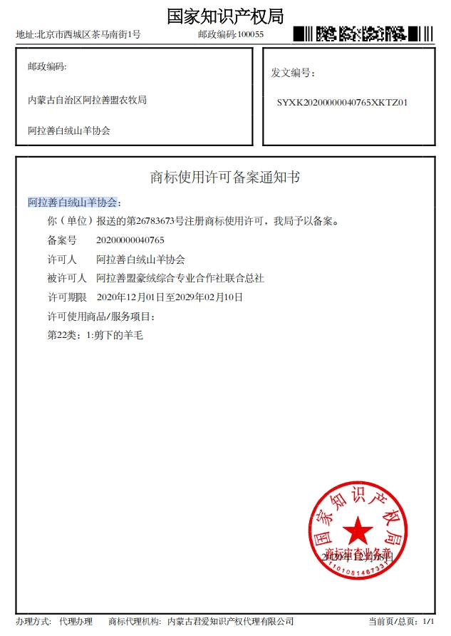 阿拉善白絨山羊協(xié)會已收到國家知識產(chǎn)權局下發(fā)的4項商標使用許可備案通知書