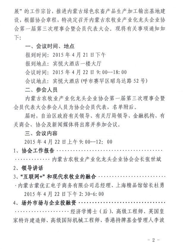 關(guān)于召開(kāi)內(nèi)蒙古農(nóng)牧業(yè)產(chǎn)業(yè)化龍頭企業(yè)協(xié)會(huì)第一屆第三次理事會(huì)暨會(huì)員代表大會(huì)的通知