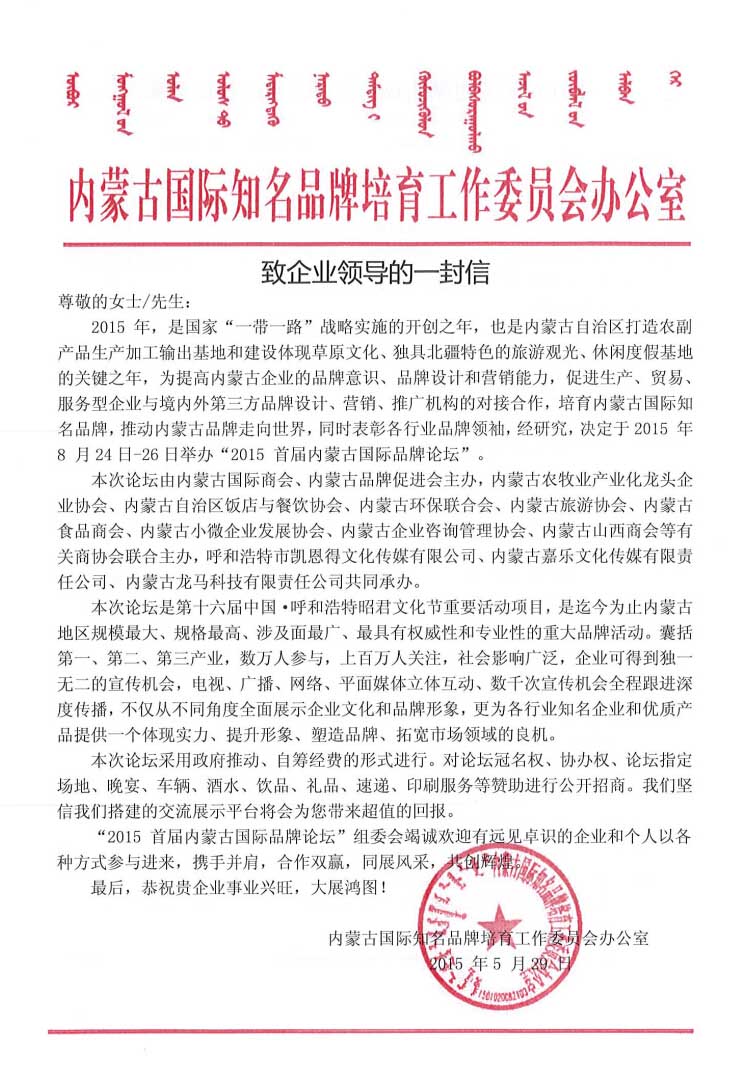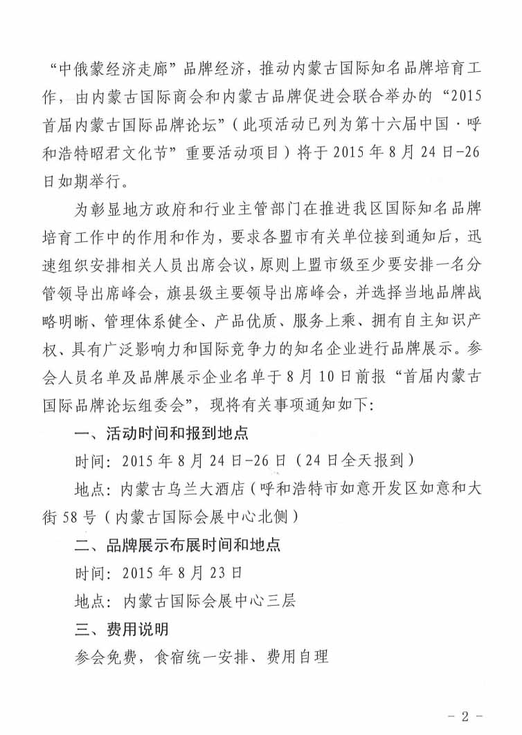 關(guān)于參加“2015首屆內(nèi)蒙古國際品牌論壇”的通知