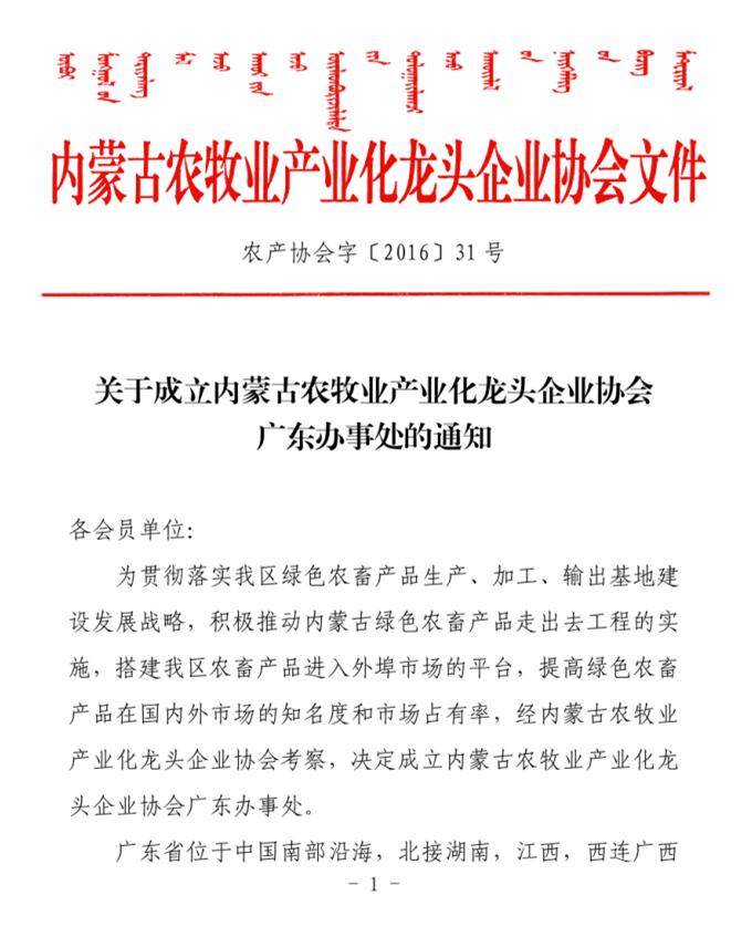 關(guān)于成立內(nèi)蒙古農(nóng)牧業(yè)產(chǎn)業(yè)化龍頭企業(yè)協(xié)會(huì)廣東辦事處的通知