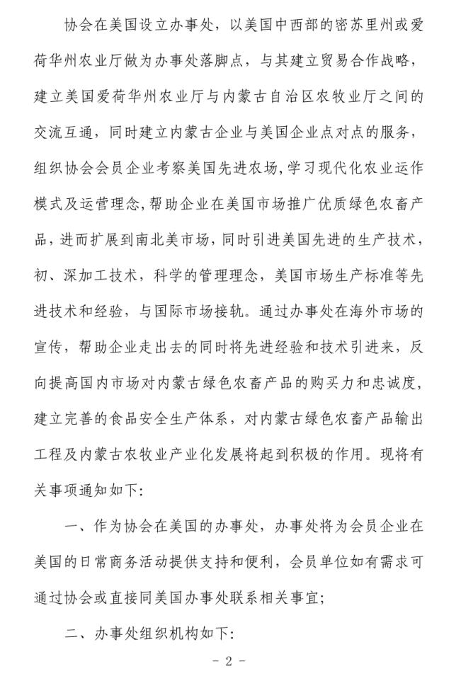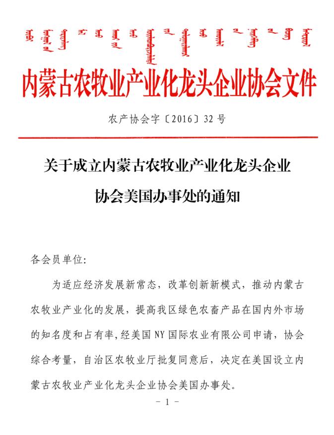 關(guān)于成立內(nèi)蒙古農(nóng)牧業(yè)產(chǎn)業(yè)化龍頭企業(yè)協(xié)會(huì)美國辦事處的通知