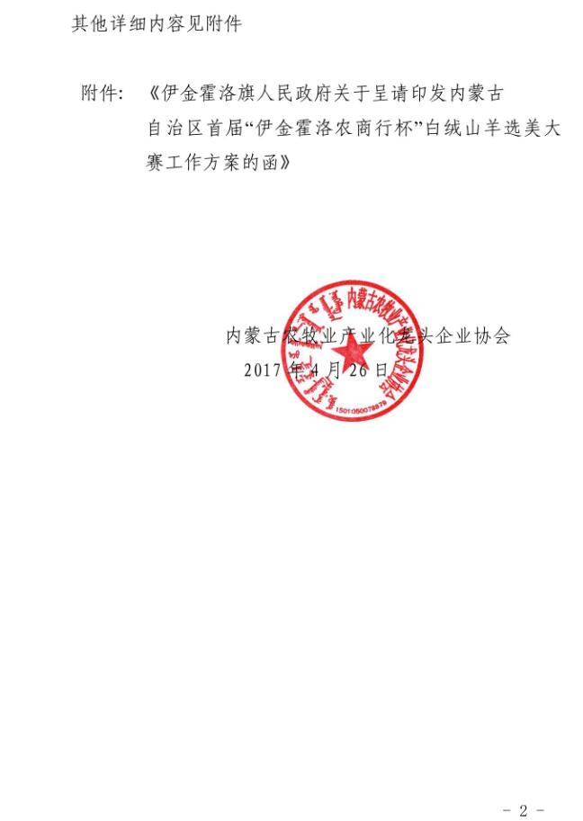 伊政函【2017】64號關(guān)于呈請印發(fā)內(nèi)蒙古自治區(qū)首屆“伊金霍洛農(nóng)商行杯”白絨山羊選美大賽工作方案的函