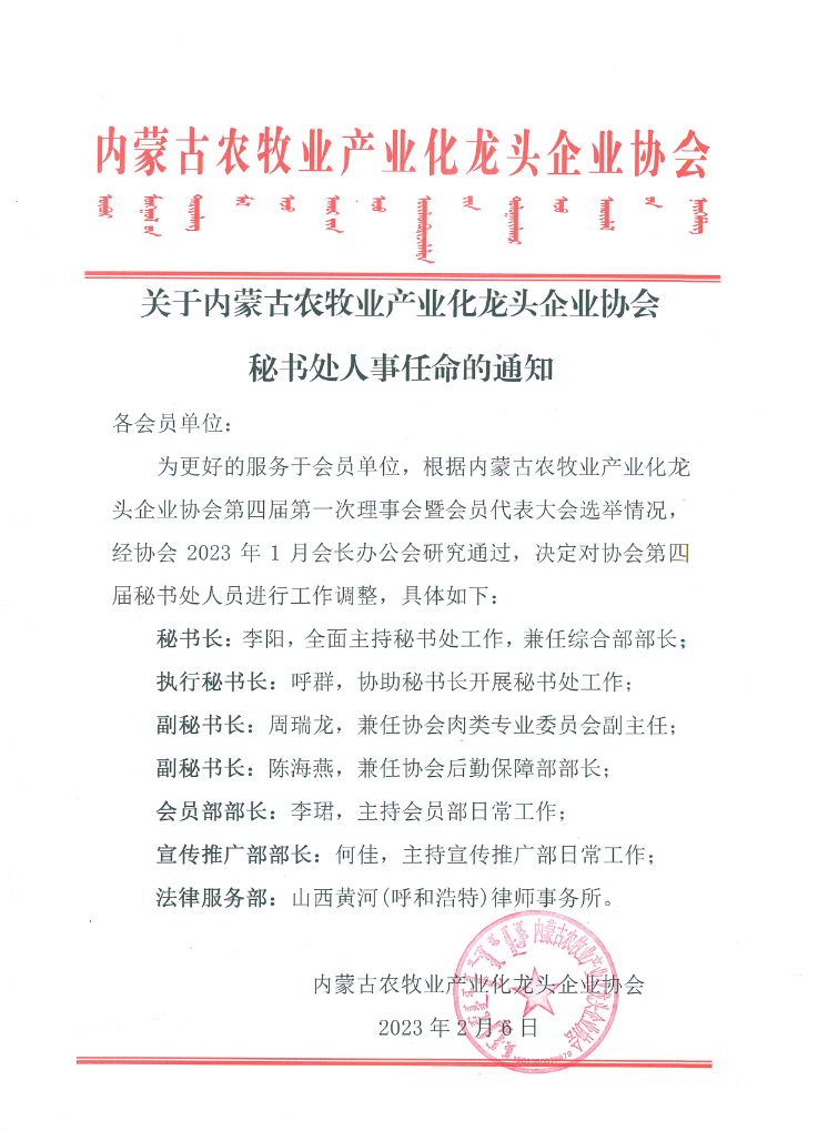 關(guān)于內(nèi)蒙古農(nóng)牧業(yè)產(chǎn)業(yè)化龍頭企業(yè)協(xié)會(huì)秘書處人事任命的通知
