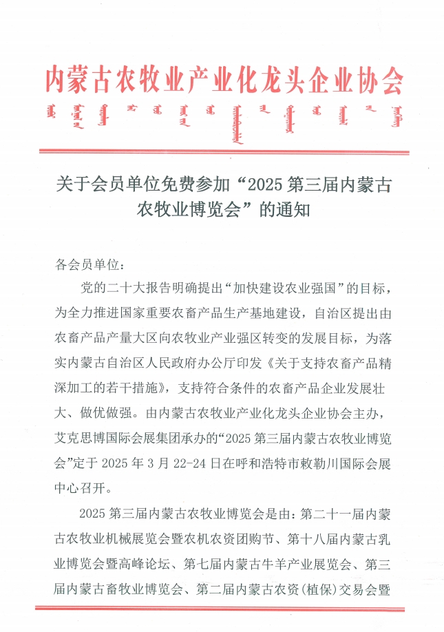 關(guān)于會(huì)員單位免費(fèi)參加“2025第三屆內(nèi)蒙古農(nóng)牧業(yè)博覽會(huì)”的通知