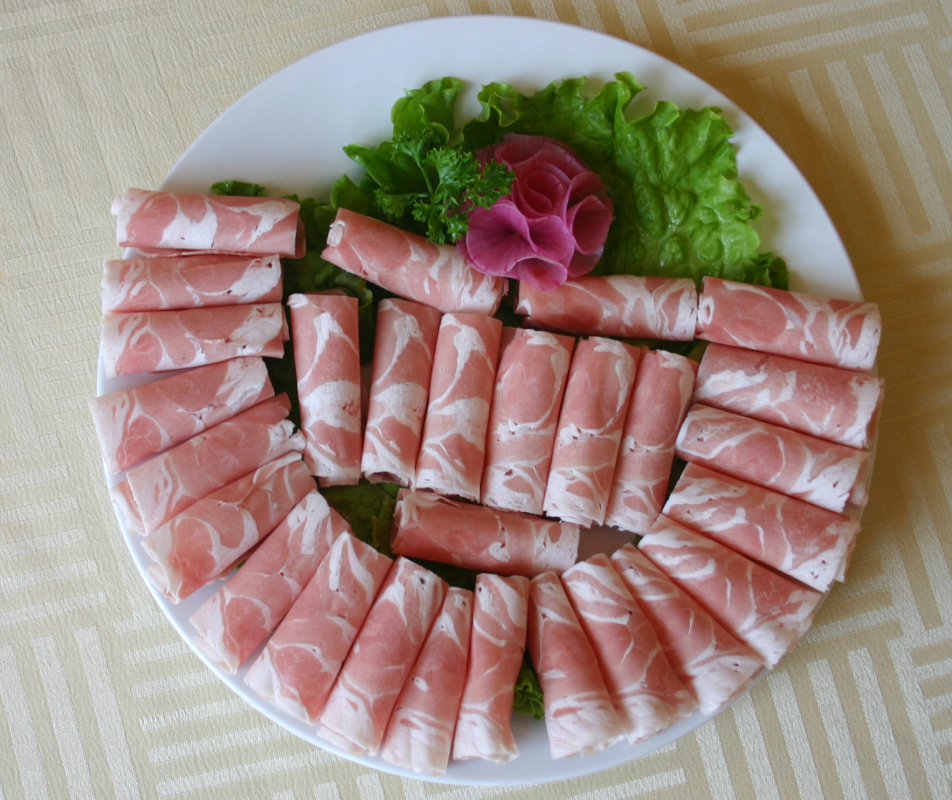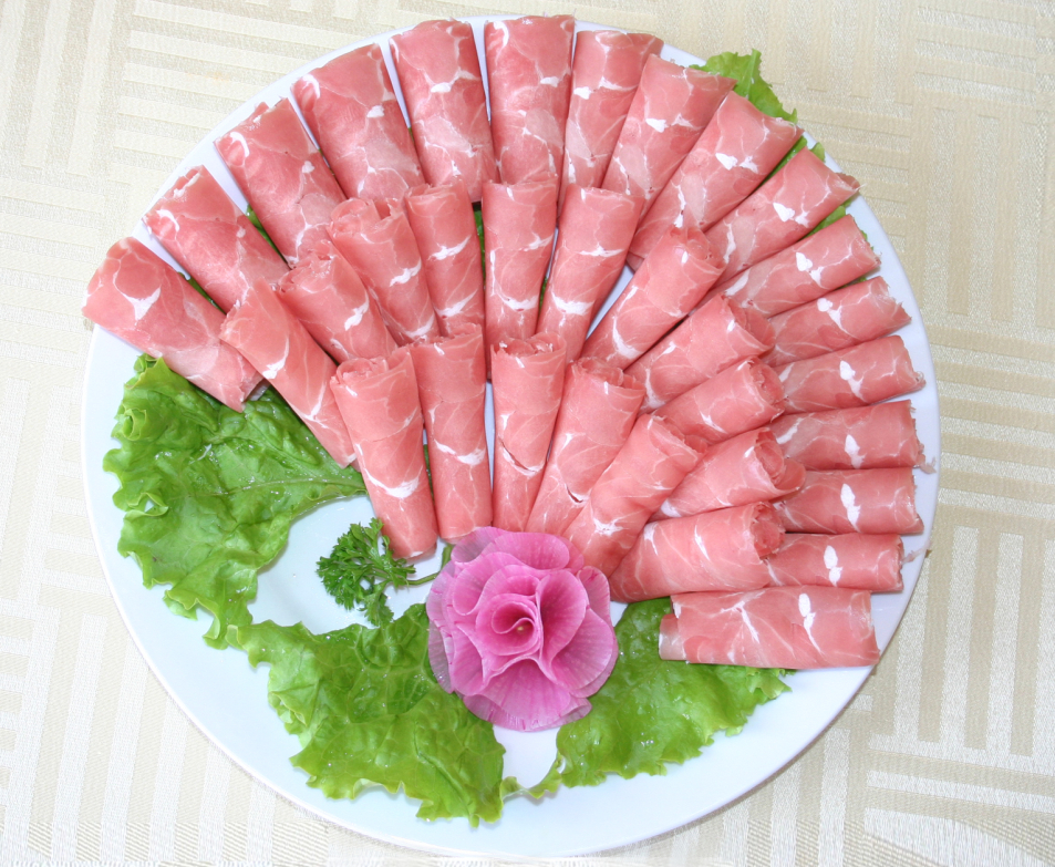 七、   杜泊羊肉卷:選用原料:采用南非引進(jìn)的杜伯羊,經(jīng)過雜交改良的品種。肉中脂肪分布均勻,胴體品質(zhì)高。經(jīng)選修之后,全部按照肥瘦搭配制成羊肉卷。一涮即熟、就涮不老。