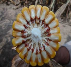 春播區(qū)從出苗至成熟126天左右。株型緊湊,株高271-286cm,穗位96cm。穗行數(shù)16-18 行,紅軸,果穗整齊、均勻;出籽率高達(dá)90%,軸細(xì)、粒深;長勢整齊一致,不空桿,產(chǎn) 量年度間差異小,穩(wěn)產(chǎn)性好。