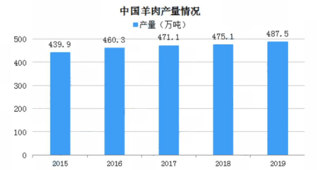 2019年內蒙古羊肉產量位居第一達到109.8萬噸,新疆、山東排名第二和第三,產量分別為60.3萬噸、36.9萬噸,此外,河北、河南、四川、甘肅、云南羊肉產量超20萬噸。2015年全國羊肉產量439.9萬噸,2019年增至487.5萬噸,同比增長2.6%。