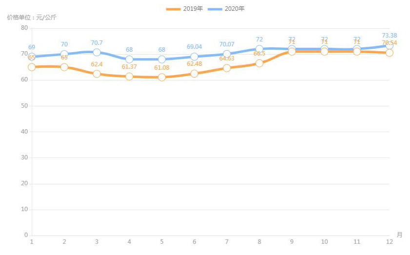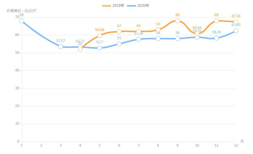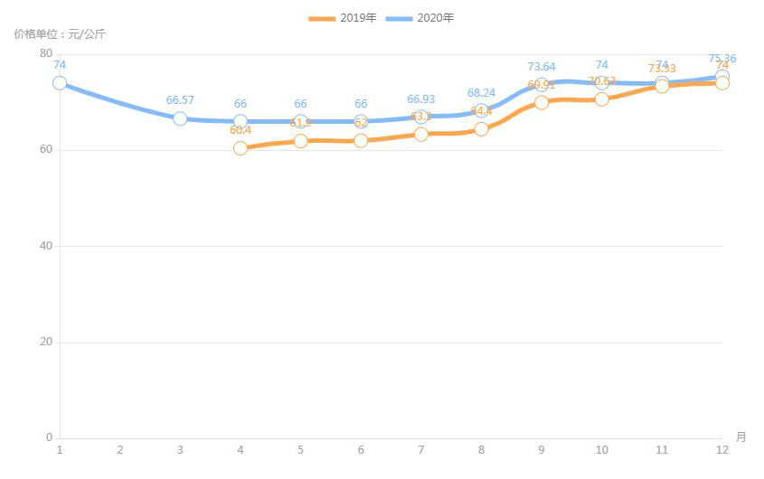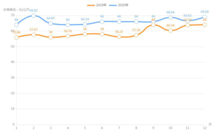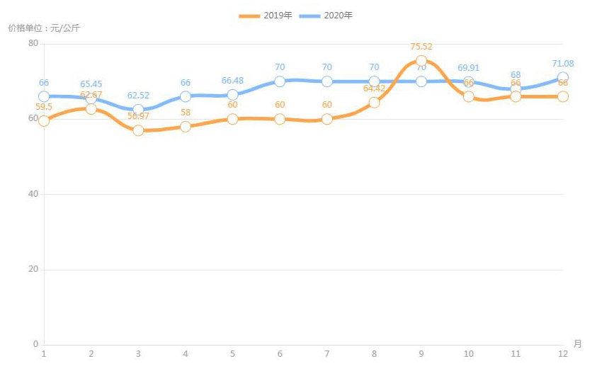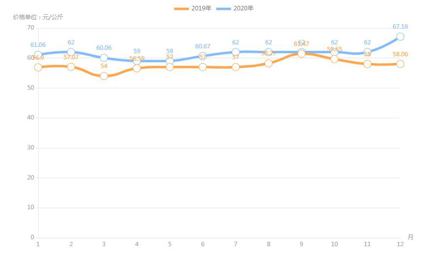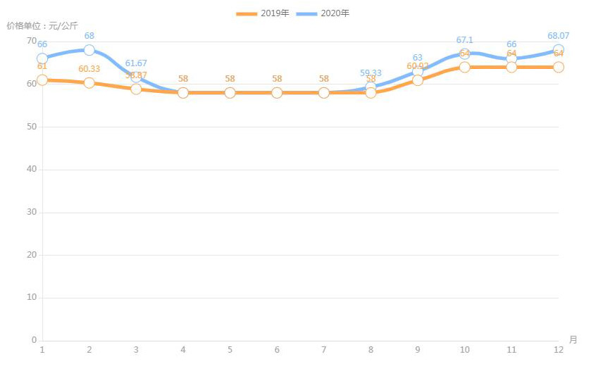 對內蒙古幾大農貿批發(fā)市場羊肉價進行匯總分析得出:呼和浩特市內蒙古美通農產品批發(fā)市場羊肉最高價格出現(xiàn)在2020年11月68元/公斤,最低價格出現(xiàn)在2019年4月52元/公斤。呼和浩特市東瓦窯批發(fā)市場羊肉最高價格出現(xiàn)在2020年12月73.38元/公斤,最低價格出現(xiàn)在2019年5月61.08元/公斤。包頭市友誼蔬菜批發(fā)市場羊肉最高價格出現(xiàn)在2020年12月67.16元/公斤,最低價格出現(xiàn)在2019年3月54元/公斤。內蒙古赤峰西城市場羊肉最高價格出現(xiàn)在2019年9月75.52元/公斤,最低價格出現(xiàn)在2019年3月56.97元/公斤。羊肉價格和去年同期相比整體上漲,漲幅基本在每公斤5-15元左右。