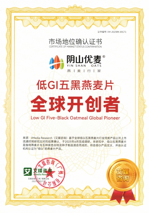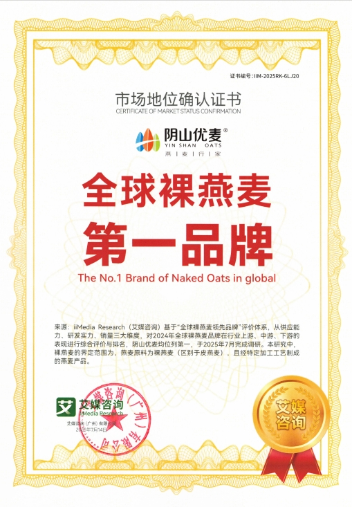 2025年7月,內(nèi)蒙古陰山優(yōu)麥食品有限公司獲得權(quán)威咨詢機構(gòu)艾媒咨詢(iiMedia Research)頒發(fā)的“全球裸燕麥第一品牌”與“中國國產(chǎn)燕麥第一品牌”市場地位確認證書。同時,其創(chuàng)新產(chǎn)品“低GI五黑燕麥片”亦被權(quán)威認證為全球開創(chuàng)者,標志著陰山優(yōu)麥在全球燕麥行業(yè)取得突破性成果。